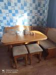 🔹 Їдальня зона — зручний дерев’яний стіл із м’яким кутком та стільцями, велике вікно забезпечує гарне природне освітлення.